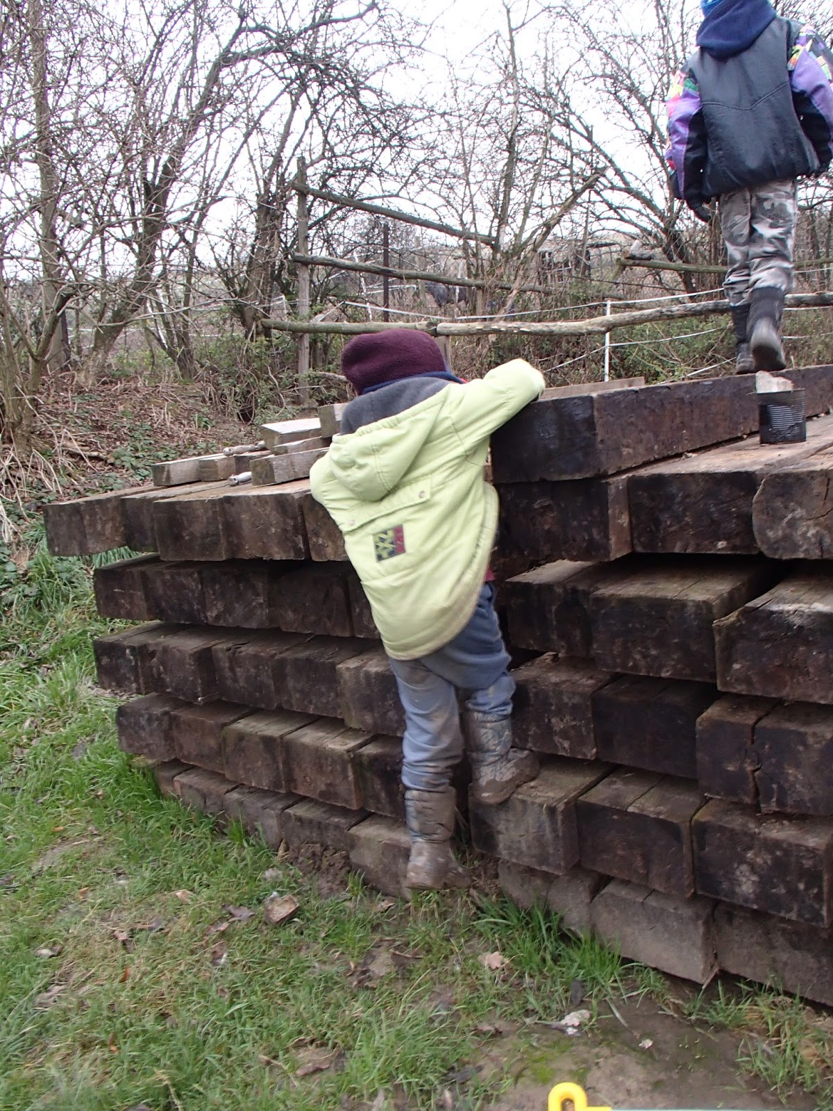 Tymczasem woda z roztopionego lodu kałużowego zaczęła wrzeć i Pawełek, nie wiem w jaki sposób, przeniósł wrzątek na Titanica (stertę starych podkładów kolejowych, wykorzystywanych jako słupy do ogradzania padoków dla koni). Michał z Krzychem też się wdrapali na statek, który od niepamiętnych czasów jest miejscem tysiąca ciekawych zabaw.